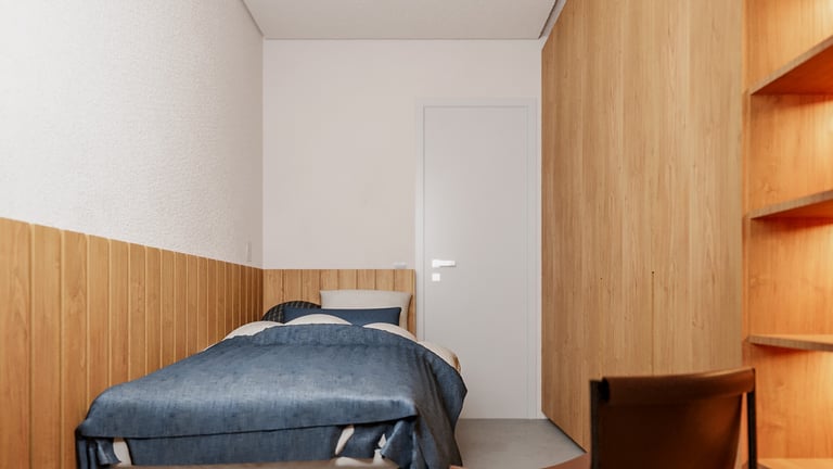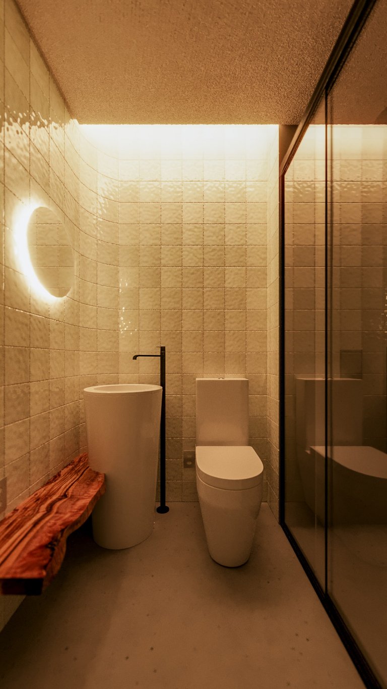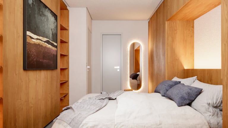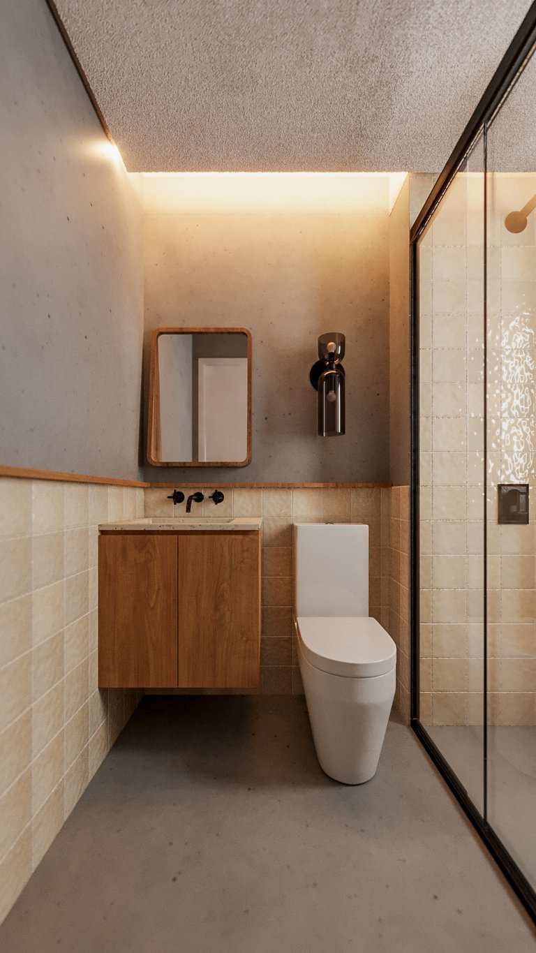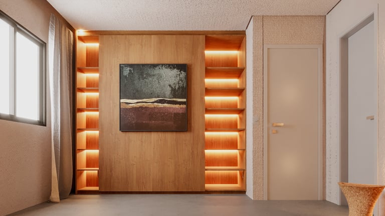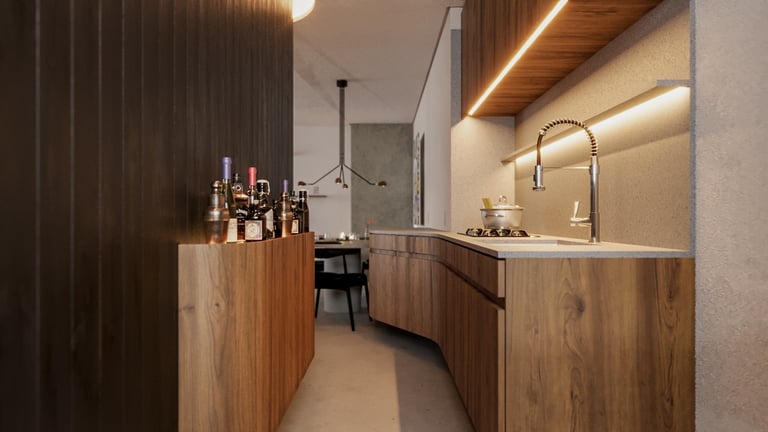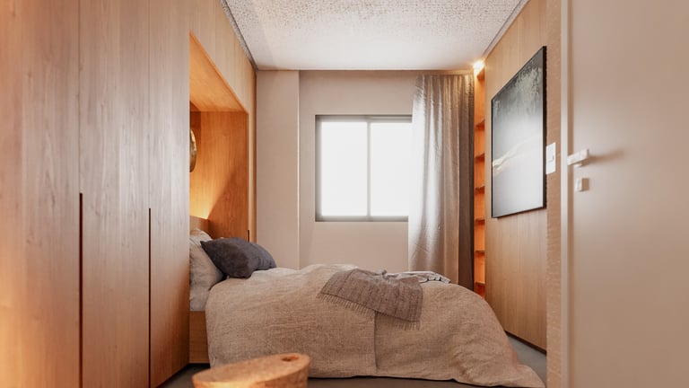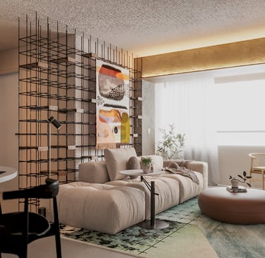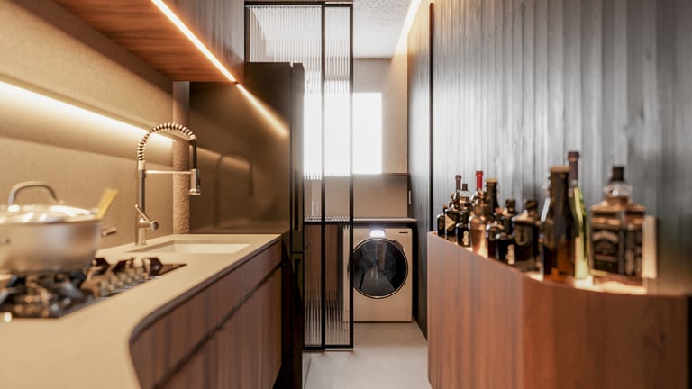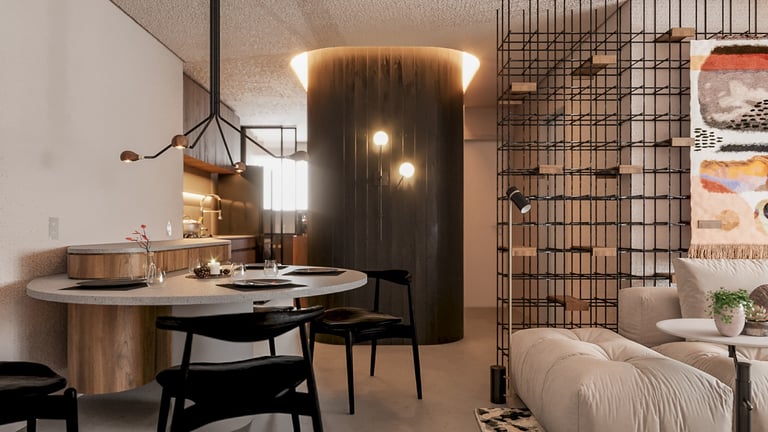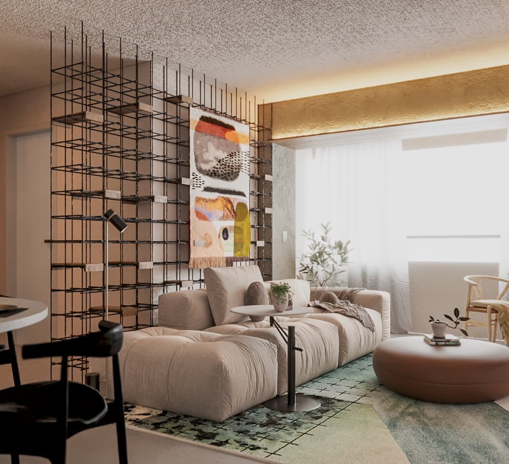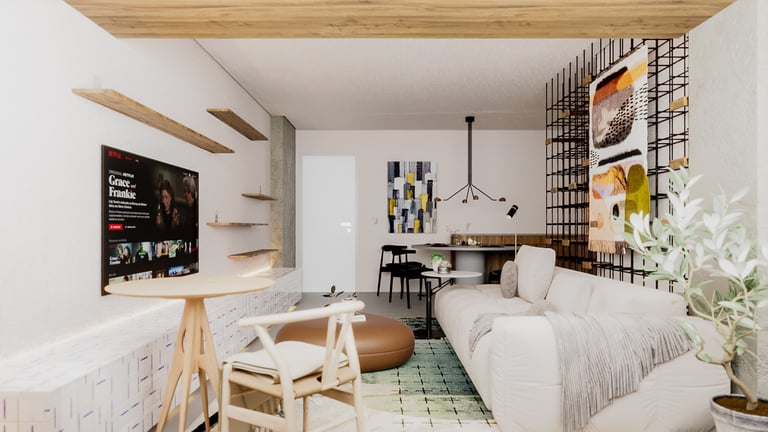 O projeto NAMA marca o início da vida a dois em um primeiro apartamento, pensado para ser fluido sem perder a personalidade. A leveza foi trabalhada em soluções como o arredondamento das quinas do banheiro social, que suaviza a circulação entre a sala e a cozinha. Um balcão linear percorre os dois ambientes e se desdobra em uma mesa curva na área de jantar, criando continuidade e movimento. A estante vazada delimita e acolhe ao mesmo tempo, separando a área íntima e abraçando o sofá com suavidade. Na suíte, madeira clara e tons neutros reforçam a sensação de calma. Removemos a parede entre dois quartos para ampliar a área e criamos um armário central que divide e se abre tanto para a suíte quanto para o quarto de hóspedes, pensado também para uma possível adaptação futura como quarto de bebê, mantendo a neutralidade e flexibilidade do espaço.