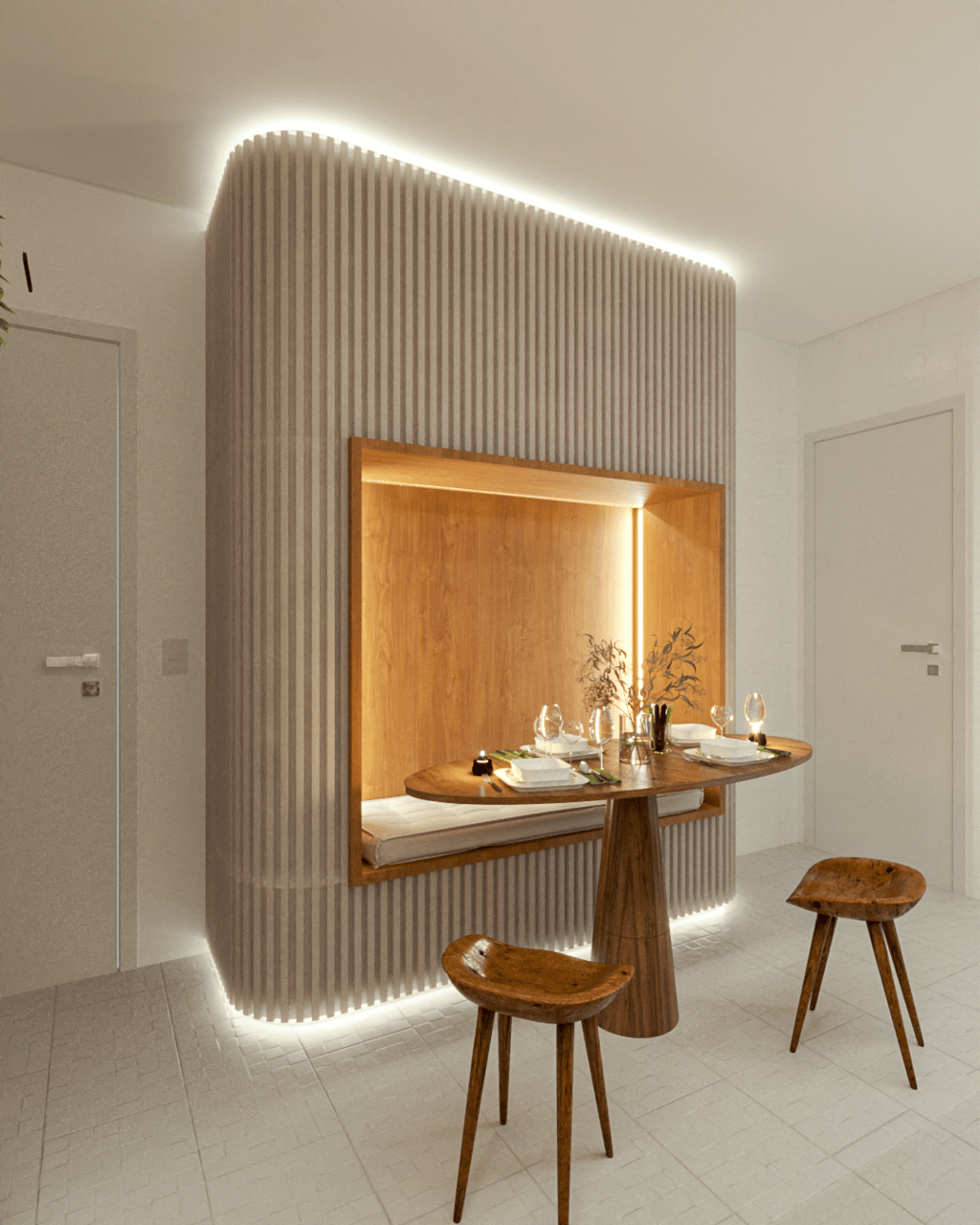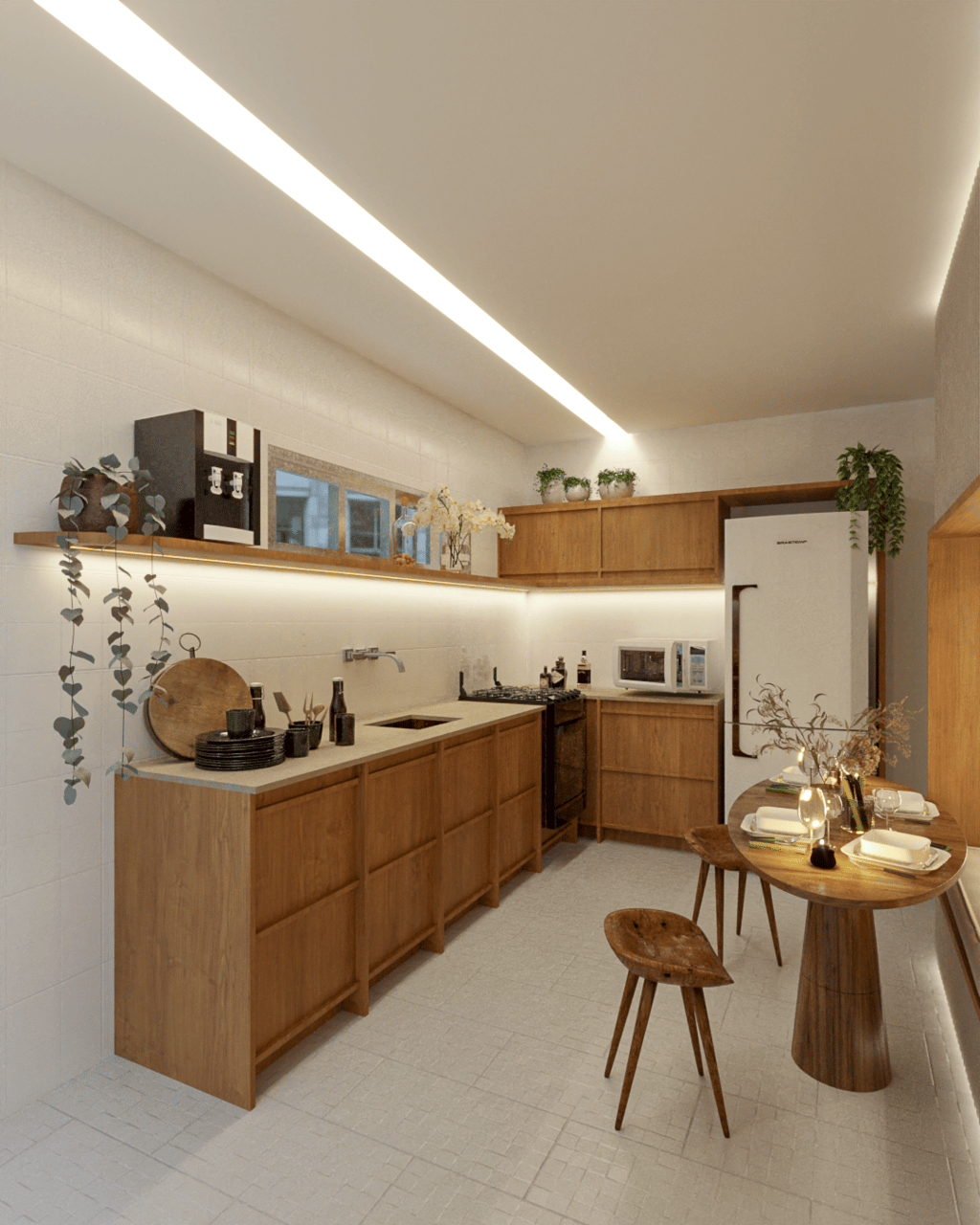 A cozinha LEAL foi pensada para ser prática, fluida e generosa em espaço, sem abrir mão da leveza visual. A cliente buscava um ambiente mais clean, com muitos armários e espaço de sobra para manipulação, já que passaria a produzir doces para venda. Revestimos toda a bancada em Dekton em formato de L, otimizando o apoio para o preparo com durabilidade e estética. Na parede oposta, desenhamos um grande armário com portas de diferentes tamanhos, todas camufladas por um painel ripado que integra também um banco central. À frente, uma mesa solta cumpre o papel de espaço para refeições rápidas ou apoio em dias de produção. As banquetas sem encosto facilitam a circulação e podem ser recolhidas sob a mesa. A materialidade em tons claros e madeira traz aconchego, enquanto a iluminação pontual valoriza o uso técnico da bancada.