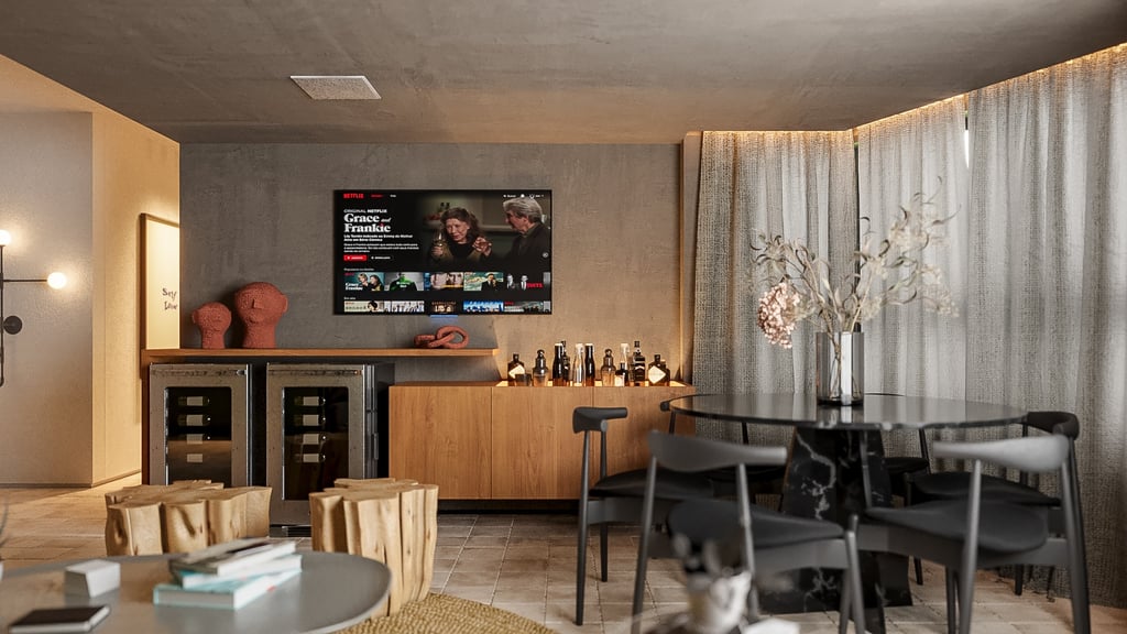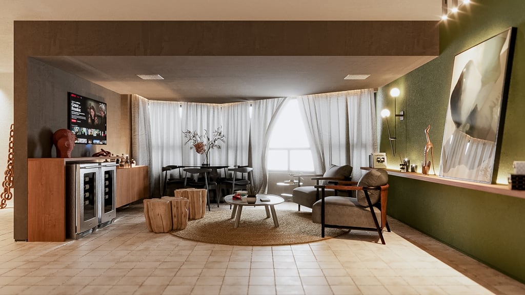 O projeto MABE nasceu do desejo de renovar uma sala que já não refletia mais o estilo de vida dos moradores. O casal, que adora receber, queria integrar melhor os espaços e transformar a varanda em uma extensão natural da sala de estar, onde pudessem aproveitar momentos descontraídos com música ou shows na TV. Como já contavam com uma sala de jantar mais formal e uma sala de TV reservada, o foco foi criar um ambiente mais fluido, voltado para encontros casuais. Desenhamos um móvel sob medida que integra bar, adega e cervejeira, organizando as funções de forma elegante e funcional. Aplicamos uma textura que contorna o rebaixo do forro da varanda, reforçando a conexão entre os espaços. Um ponto de cor percorre a parede da varanda até a cozinha, funcionando como suporte para uma galeria de quadros e objetos afetivos, trazendo ritmo, identidade e frescor ao apartamento.